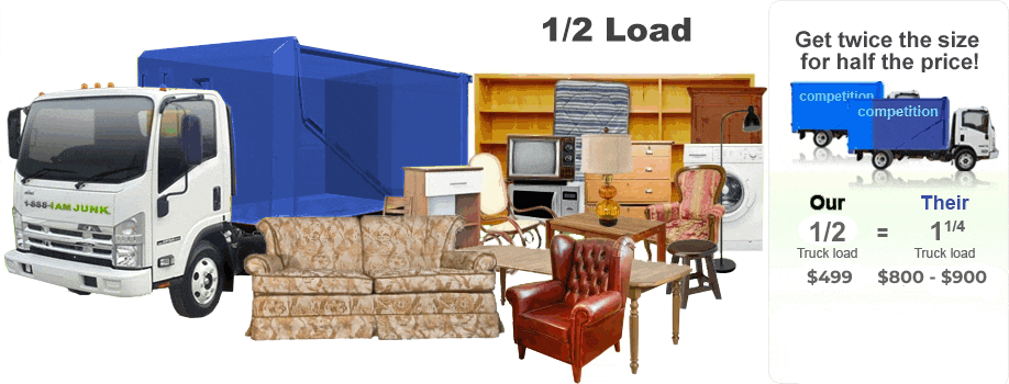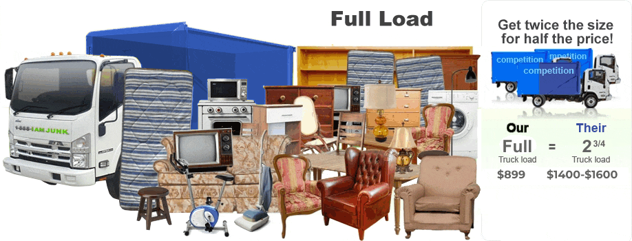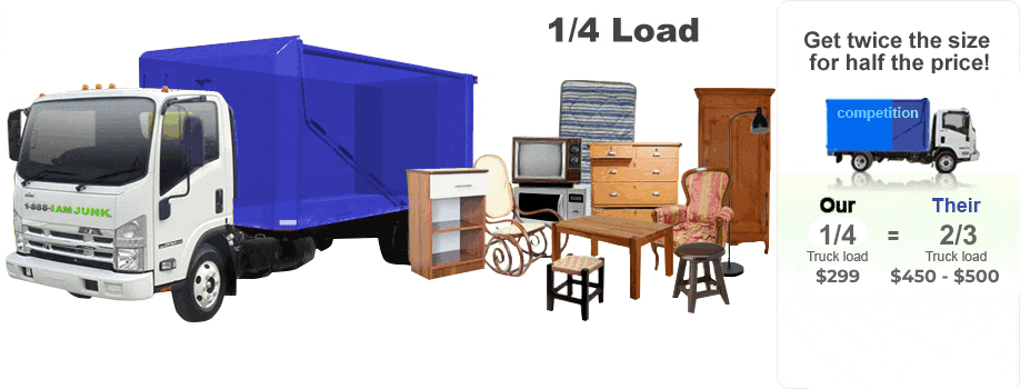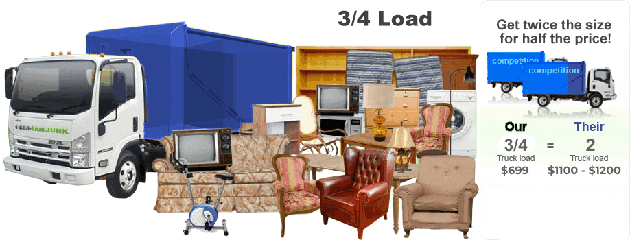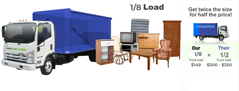 At 1-888-I AM JUNK, we charge only for the space your junk occupies in our truck, ensuring you get full professional service at a fraction of the cost. With our affordable truck load rates, you only pay for the volume of your junk, making junk removal cost-effective and hassle-free.